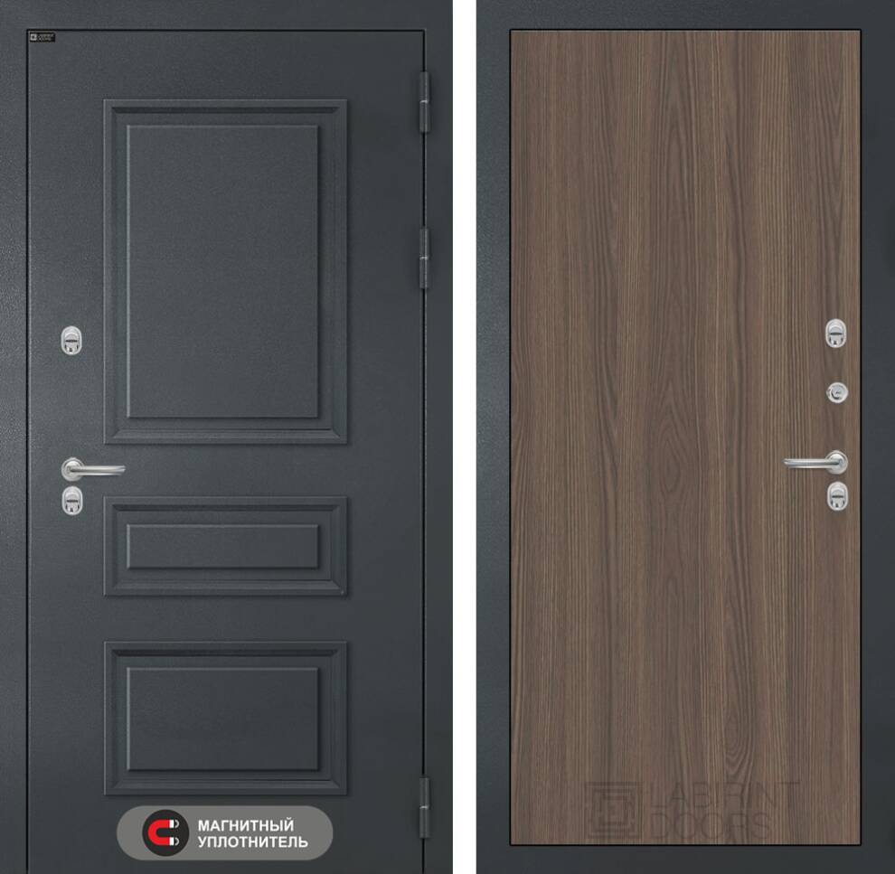 3 контура (1 магнитный) уплотнения, Терморазрыв по всей двери, полотно толщиной 105 мм, 2-х слойное утепление, 3 слоя защитного покрытия.