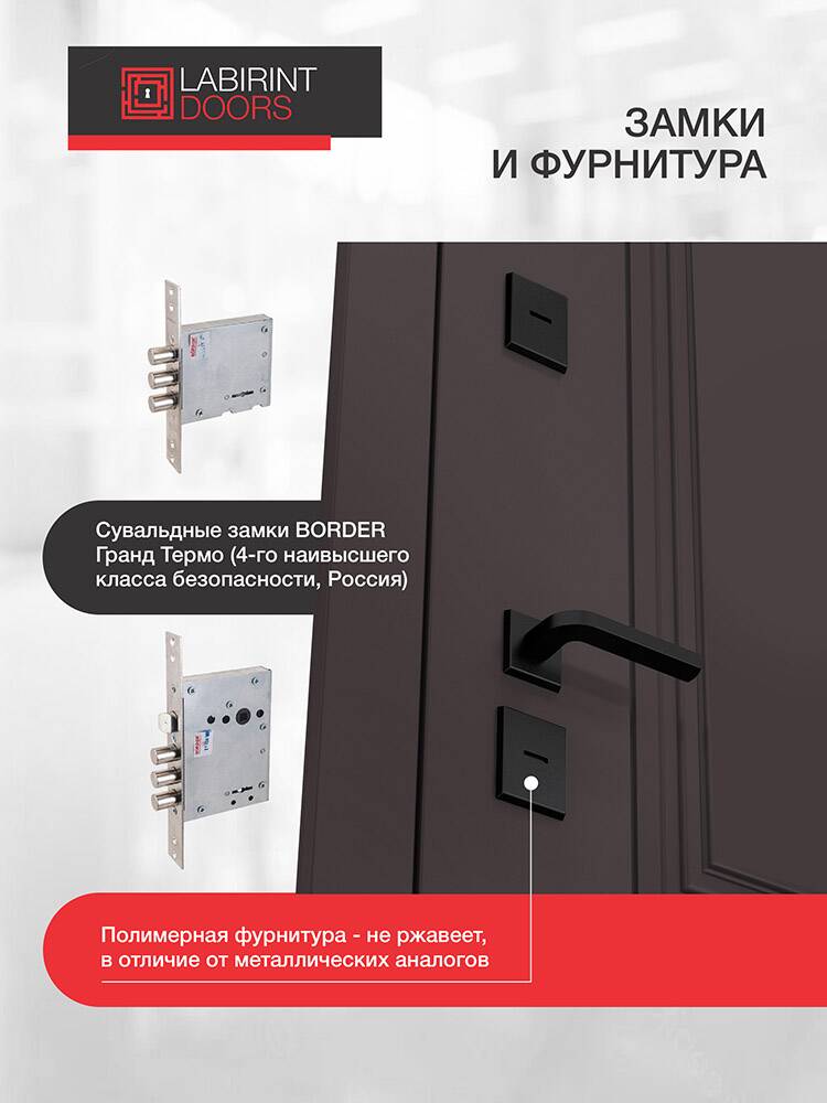 - Черная фурнитура (полимерная): накладки сувальдные со шторкой, дверная ручка, ночная задвижка, металлический эксцентрик с защитной вставкой.